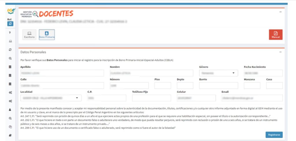 Una vez que el postulante dispone de su cuenta GEI y el rol «PAD DOCENTE» correctamente activado, el proceso de inscripción dentro de la plataforma implica ingresar a la sección de «Juntas Calificadoras» y, posteriormente, seleccionar la opción de «Bono Secundario» para iniciar la carga de datos y documentación.