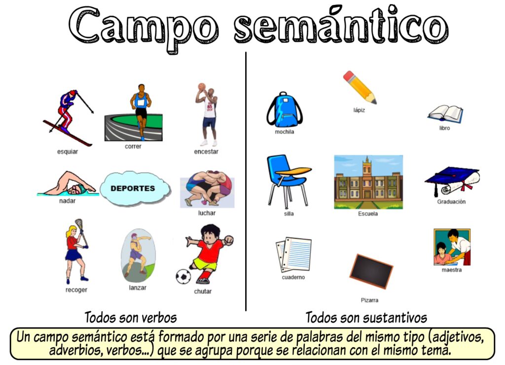 Un campo semántico es, en esencia, un conjunto de palabras que comparten un núcleo de significado común o están relacionadas por algún tipo de conexión de sentido. Pensemos, por ejemplo, en el campo semántico de 'deportes'. Inmediatamente nos vienen a la mente palabras como fútbol, tenis, básquet, natación, atletismo, ciclismo, entre otras. Todas estas palabras giran en torno a la idea de actividad física reglamentada o recreativa.