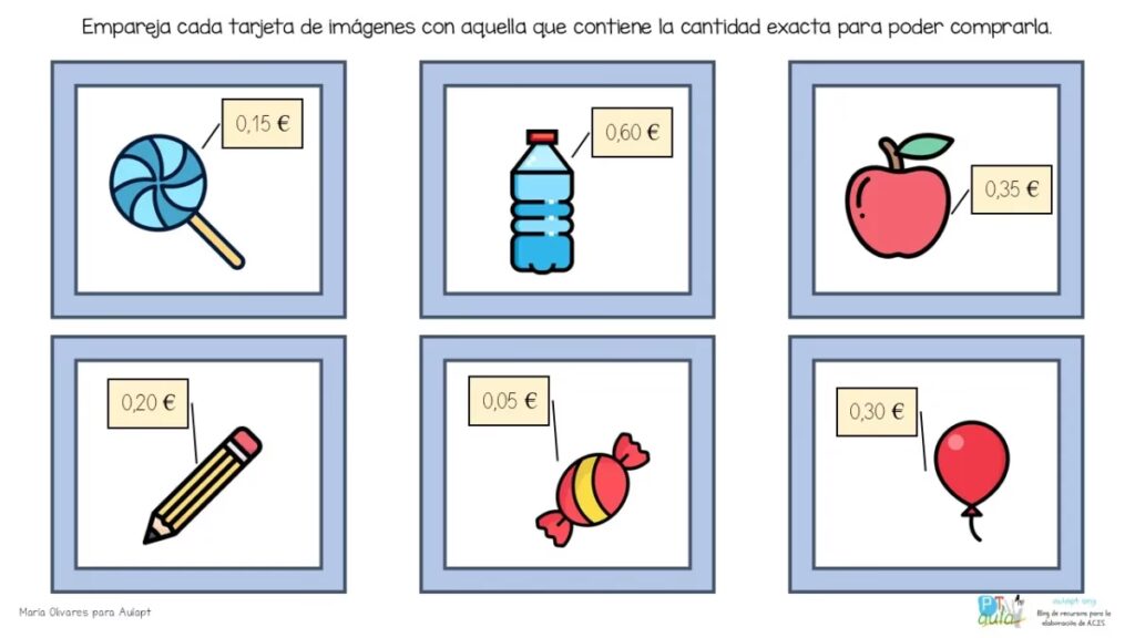 - Emparejamiento de Dinero: Cree un conjunto de tarjetas con diferentes cantidades de dinero escritas en ellas y otro conjunto de tarjetas con representaciones de monedas correspondientes. Los estudiantes pueden emparejar las tarjetas para practicar el conteo de dinero y reconocer diferentes valores de monedas. Esta es una excelente herramienta para usar en centros o en grupos pequeños. Los estudiantes pueden jugar mientras colaboran.