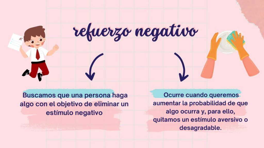 | Refuerzo | Negativo | Retirar estímulo aversivo | Aumenta probabilidad | Eximir de tarea menor por completar una mayor |