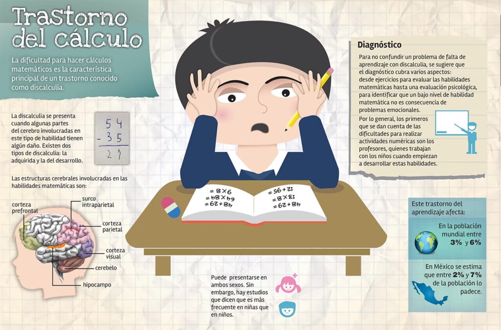 Este trastorno puede manifestarse de diferentes maneras, y no todos los niños con discalculia presentan los mismos síntomas. Algunos pueden tener problemas con la comprensión básica de las cantidades, mientras que otros luchan con operaciones más complejas o la resolución de problemas. La discalculia se considera un trastorno del neurodesarrollo, lo que significa que se origina en el desarrollo del cerebro y no se debe a falta de esfuerzo o mala enseñanza, aunque estas pueden influir en su manifestación.