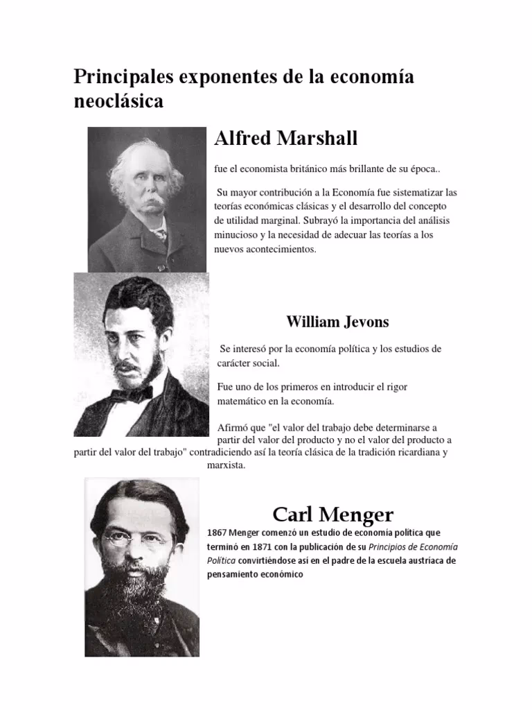 Los principales representantes considerados fundadores de la escuela neoclásica incluyen a William Stanley Jevons, Carl Menger y Léon Walras, quienes desarrollaron de forma independiente la teoría de la utilidad marginal. Alfred Marshall es una figura central y muy influyente por su síntesis de las ideas y su contribución al análisis de oferta y demanda.