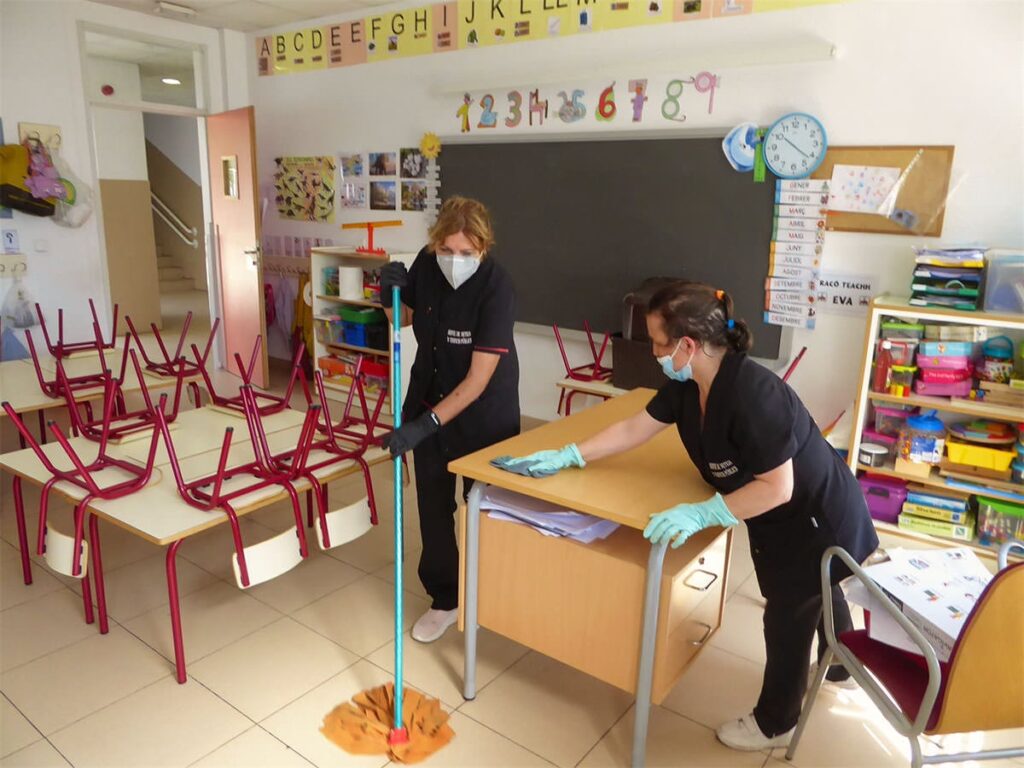 Para minimizar las interrupciones, las tareas de limpieza profunda suelen organizarse fuera del horario lectivo. Esto a menudo implica trabajar a primera hora de la mañana, a última de la tarde o incluso en horario nocturno, cuando el colegio está vacío o con mínima actividad. Las labores de mantenimiento o repaso durante el día se realizan de forma discreta y rápida, utilizando señalización adecuada para evitar accidentes.
